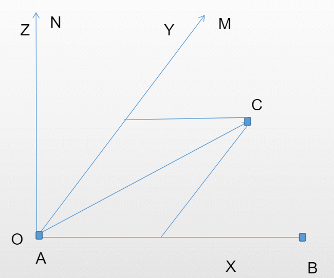 以A为原点,AB为X正向,AM为Y正向,AN为Z正向的坐标系就可以建立,这就是工作台坐标系。