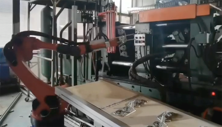 全自动压铸循环流程,包括清理模具-喷刷涂料-合模-浇注-压射-凝固-开模-推出-取出铸件。简单就是喷雾-舀汤-取件三大流程。针对工艺的重复繁琐,工人在高强度下劳作下,注意力分散,容易出现的作业事故。同时,从事铸造人员的流失,行业向自动化方向开展成了必然。压铸“三位一体”机器人从喷雾-舀汤-取件三步走实现自动化生产,产品压铸成型,等待机械手取件,并清理模具,喷刷涂料模具,重新进入下一步舀汤浇注压铸产品的循环运作。高精度,柔性化的生产,自动化机器人的应用降低了劳动强度,提高了生产效率。